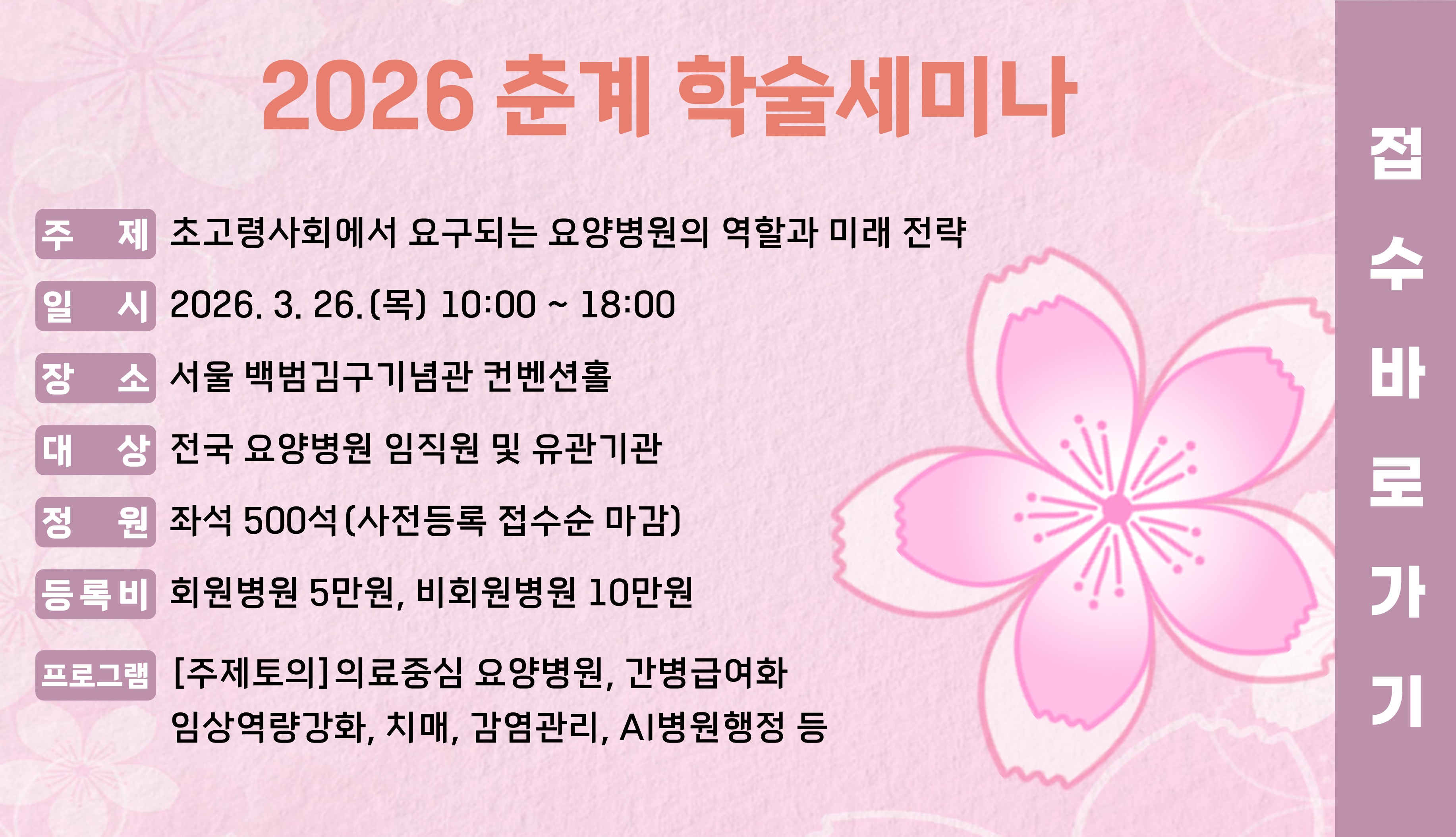 신청 바로가기협회는 초고령사회에 대응하여 요양병원의 의료기능을 강화하고 지속가능한 운영 기반을 마련하기 위한 정책적 방향을 모색하고자 「2026 춘계 학술세미나」를 개최합니다.이번 세미나는 간병급여화 추진 방향과 의료중심 요양병원 역할 정상화를 중심으로, 치매·파킨슨 관리 및 치료 전략, 임상역량강화, 감염관리 대응, AI 기반 행정혁신 등 현안과 미래 과제를 폭넓게 다루고자 합니다.초고령사회에서 요양병원의 역할을 재정립하고 정책적 방향을 모색하기 위한 학술세미나와 「2026년 정기총회」를 함께 개최하오니, 아래를 참고하시어 많은 관심을 바랍니다.가. 주제 : 초고령사회에서 요구되는 요양병원의 역할과 미래 전략나. 일시 : 2026. 3. 26.(목) 10:00 ~ 18:00다. 장소 : 서울 백범김구기념관 컨벤션홀라. 대상 : 전국 요양병원 임직원 및 유관기관마. 총회 : 2026년 정기총회(11:50 ~ 12:10)바. 신청 : 3. 20.(금)까지, 온라인 신청서 작성 제출사. 비용 : 1인당 회원병원 5만원 / 비회원·회비미납병원 10만원[중식 제공] (※입금 : 기업은행 050-162378-04-026 대한요양병원협회)